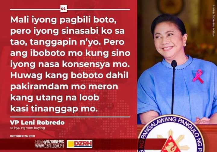 Vice President Leni Robredo tells voters to accept money from politicians. Iyong sa akin tanggapin mo iyong pera pero iboto sa konsensya she added. Huwag kang boboto dahil pakiramdam mo meron kang utang na loob kasi tinanggap mo continued the Vice President.